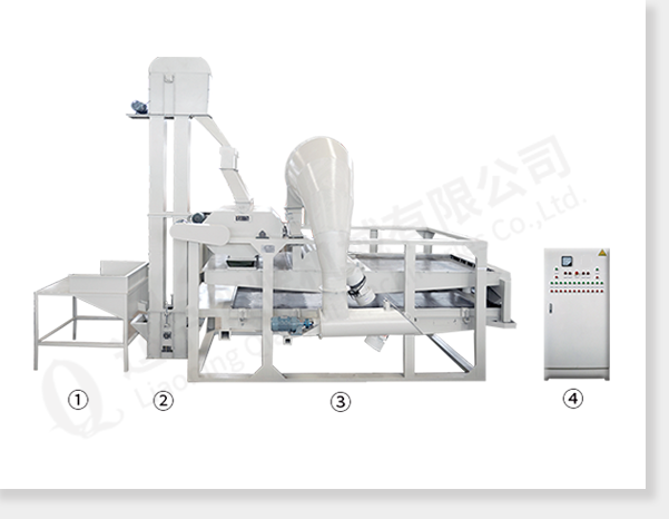①  input hopper ②  bucket elevator ③ main part of the equipment(dehullers,air separator and seed-kernel separator)  ④ electric control cabinet